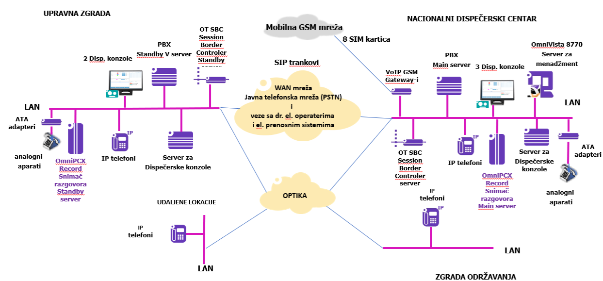 Izvršeno je razdvajanje na poslovnu  i operativnu telefoniju. Poslovna telefonija se oslanja na mrežne resurse IT službe i služi za svakodnevne administrativne aktivnosti osoblja kompanije. Operativna telefonija predstavlja možda i najvažniji segment ovog sistema i služi za vezu operatora prenosnog sistema sa trafostanicama, CEDIS-om, EPCG-om, operatorima prenosnih sistema u susjedim državama, ekipama održavanja i svim drugim entitetima od značaja za upravljanje elektroenergetskim sistemom Crne Gore. Za ovu svrhu predviđena je i implementirana posebna IP/Ethernet mreža zasnovana na opremi industrijskog tipa po trafostanicama i najsavremenijim rješenjima u vidu uvezanih i redundantnih dispečerskih konzola, koje pružaju operatorima višestruko bolji pregled i upravljivost pozivima. Takođe, sistem pruža mogućnost snimanja i skladištenja poziva operativne telefonije.